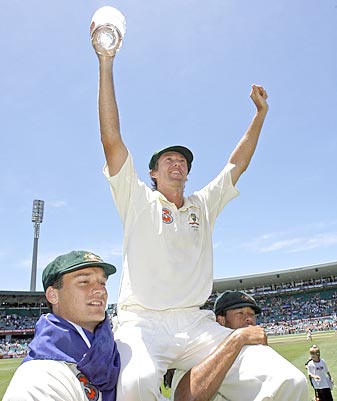 McGrath holds the Ashes trophy aloft as he is carried by teammates Clarke and Symonds.