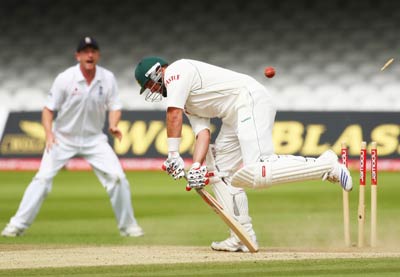 South African Jacques Kallis is cleaned up by England's Ryan Sidebottom during day five of the opening Test.