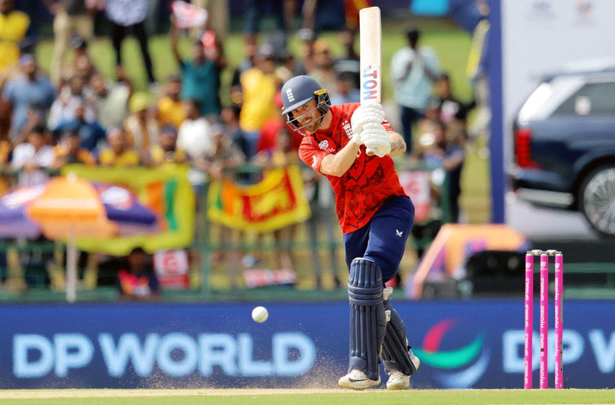 Left-arm spinner Dunith Wellalage takes the new ball from the other end. Buttler defends the first ball before he flicks the next for a single.