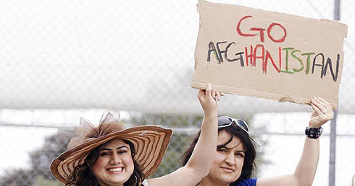 Image: Two young Afghanistan fans watch the ICC World Cricket League Division One match in 2012.