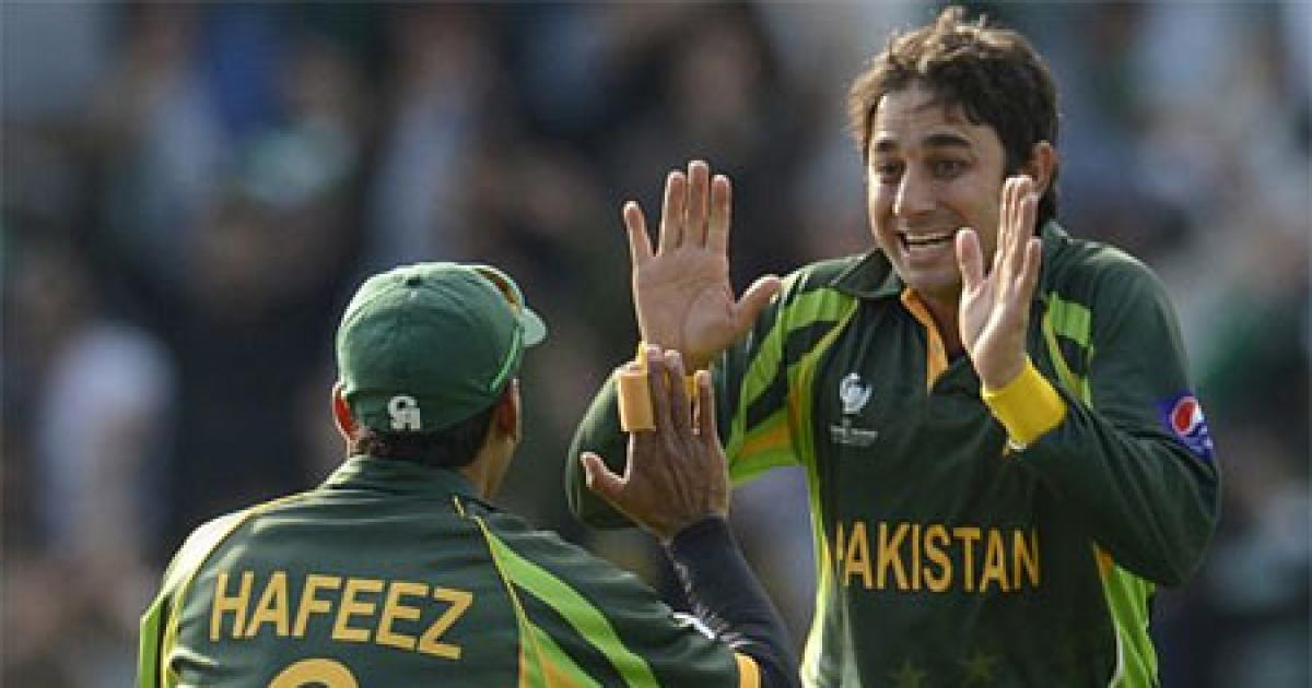 Image: Pakistan's Saeed Ajmal and Mohammad Hafeez celebrate the fall of a wicket during a match against India