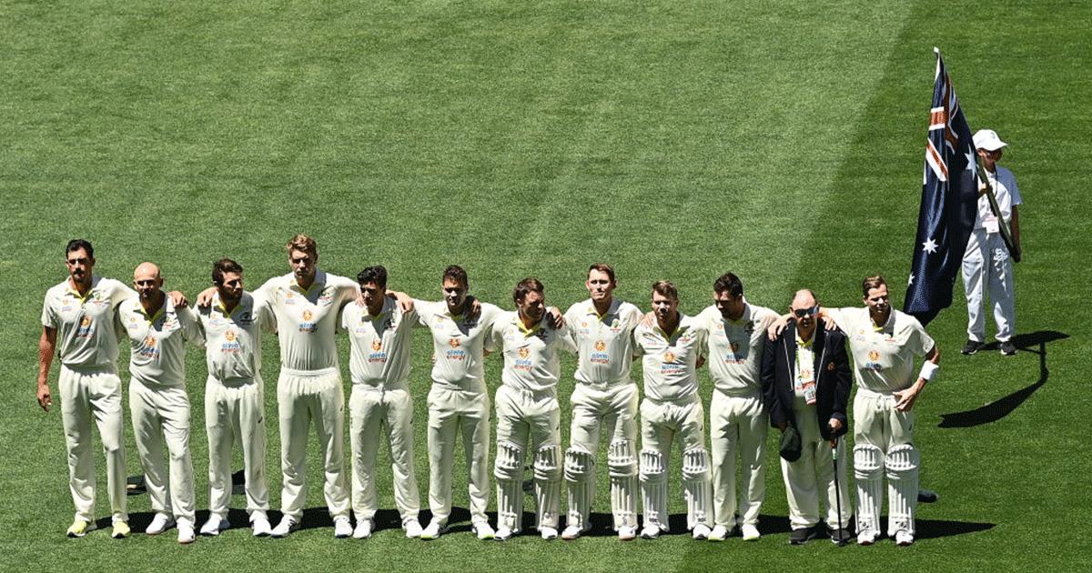 IMAGE: Australian players stand during the signing of the National Anthem before day one of the Second Ashes Test match at the Adelaide Oval in Adelaide on Thursday. Australia's players are all fully vaccinated and are free to mix in public in South Australia where active COVID cases remain low.Photograph: Quinn Rooney/Getty Images