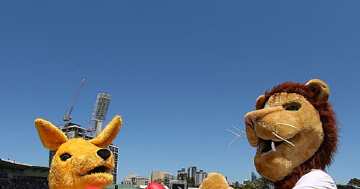 Image: An Australian kangaroo mascot and English Lion mascot pose.