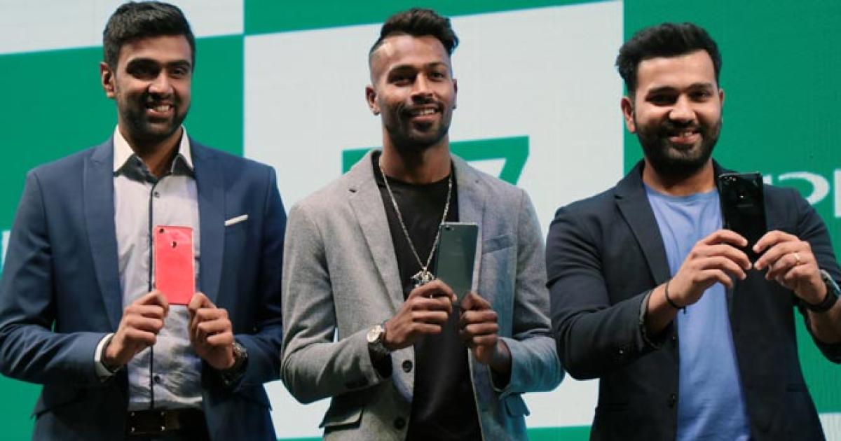 IMAGE: Ravichandran Ashwin, Hardik Pandya and Rohit Sharma pose with the newly launched Oppo F7 mobile phone in Mumbai, March 26, 2018. Photograph: Hitesh Harisinghani/Rediff.com