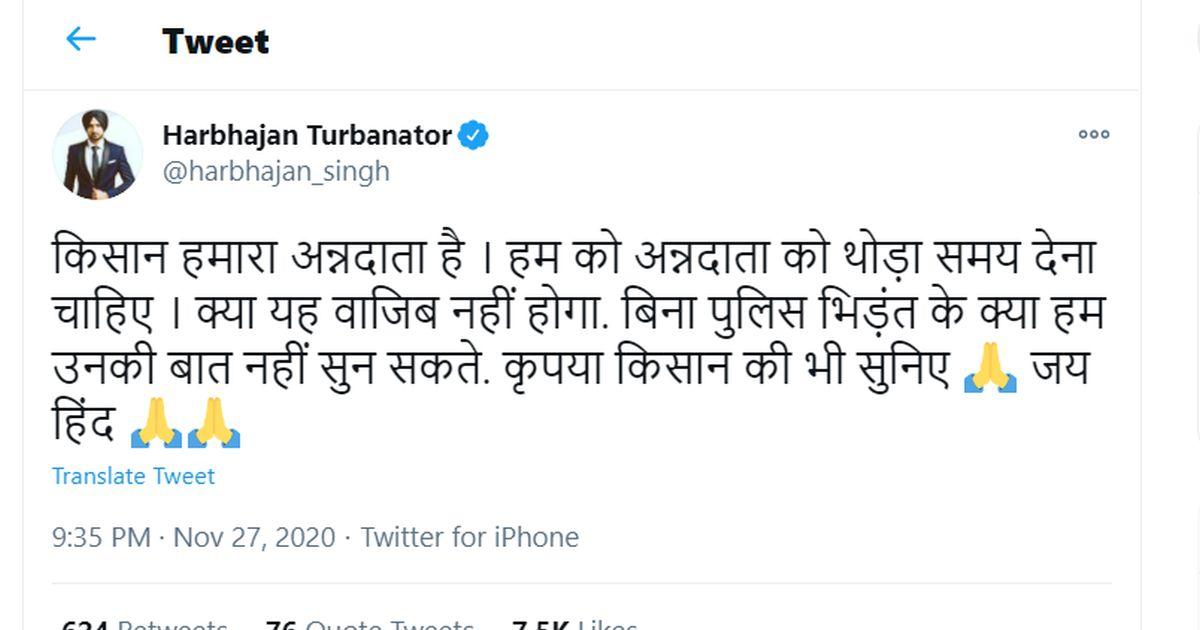 'किसान हमारा अन्नदाता है । हम को अन्नदाता को थोड़ा समय देना चाहिए । क्या यह वाजिब नहीं होगा. बिना पुलिस भिड़ंत के क्या हम उनकी बात नहीं सुन सकते. कृपया किसान की भी सुनिए. जय हिंद (Farmers are the hands that feed us. We must give some of our time to the farmers. Isn't it feasible? Without fighting with the police can't we listen to them. Please listen to what they have to say too),' Bhajji tweeted on Friday.