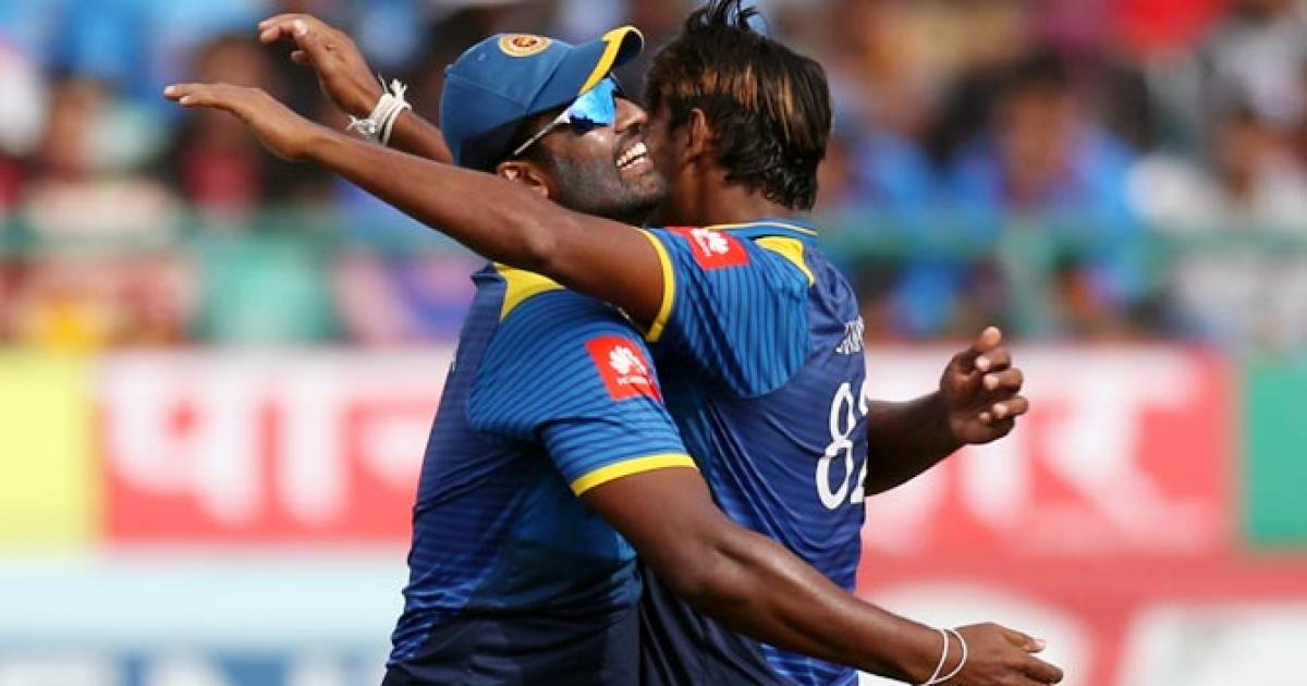 IMAGE: Thisara Perera, left, and Suranga Lakmal celebrate the dismissal of Manish Pandey. Photograph: BCCI
