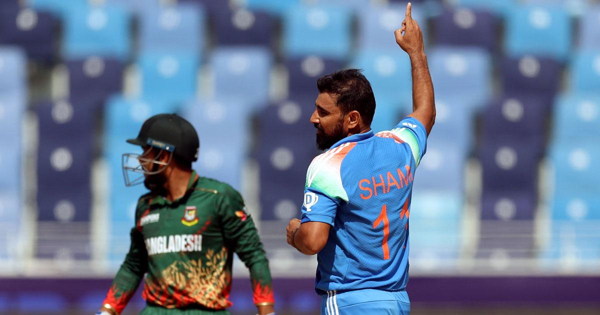 IMAGE: Mohammed Shami celebrates a wicket during the Champions Trophy match against Bangladesh in Dubai, February 20, 2025. Photograph: BCCI/X