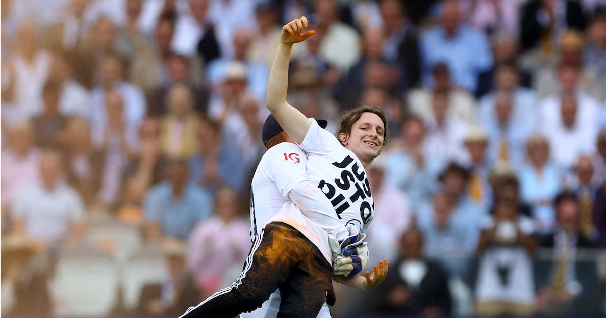 Protesters ran onto the ground and scattered orange powder on the outfield on Wednesday, before one was carried off by England wicketkeeper Jonny Bairstow, who dropped the protestor to the ground outside the boundary rope.