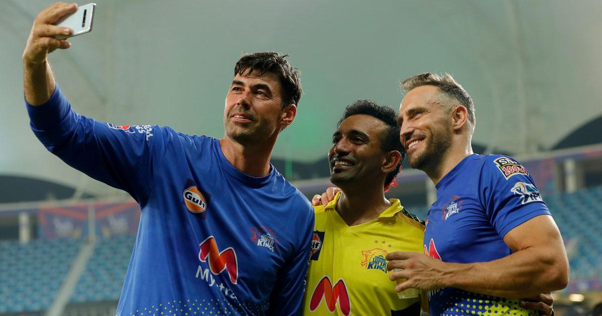 IMAGE: Chennai Super Kings coach Stephen Fleming clicks a selfie with Robin Uthappa and Faf du Plessis after winning the IPL title. Photograph: BCCI