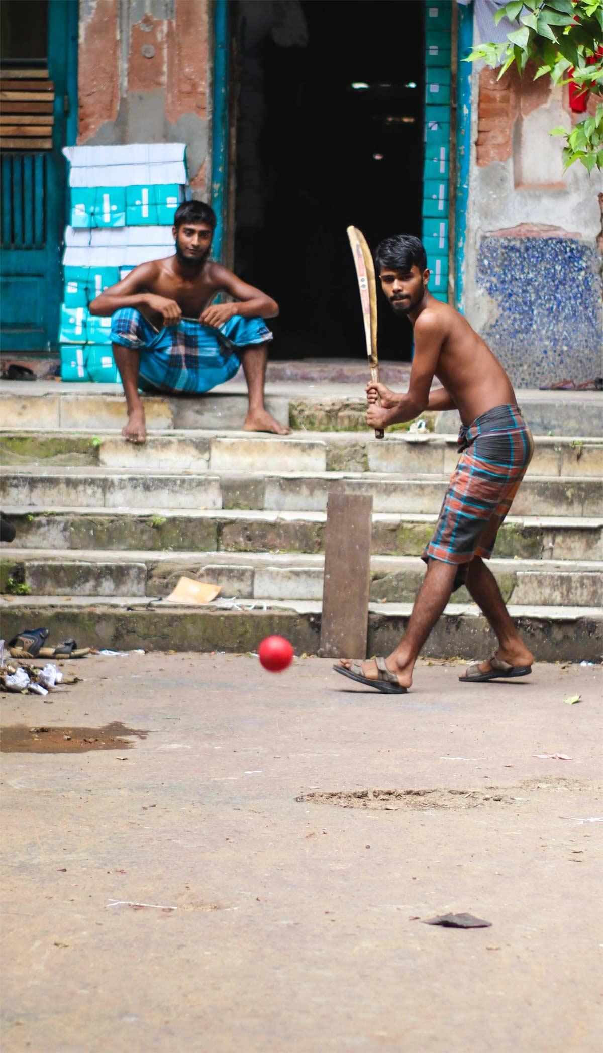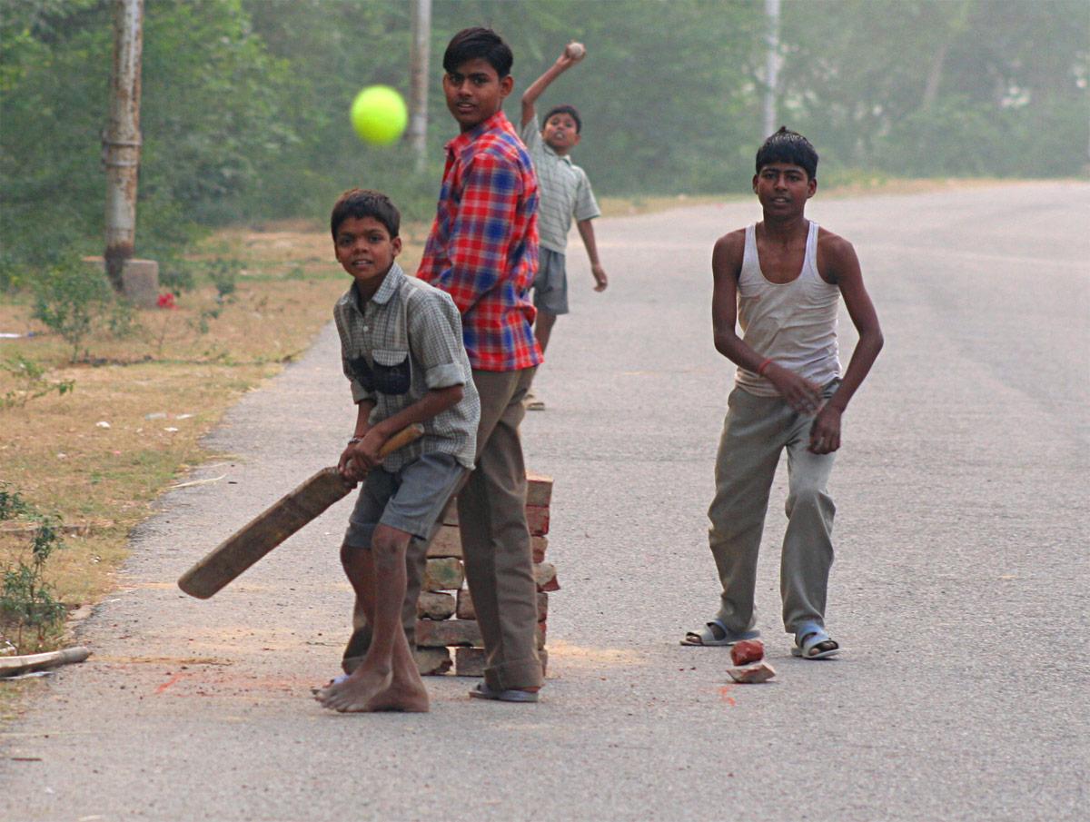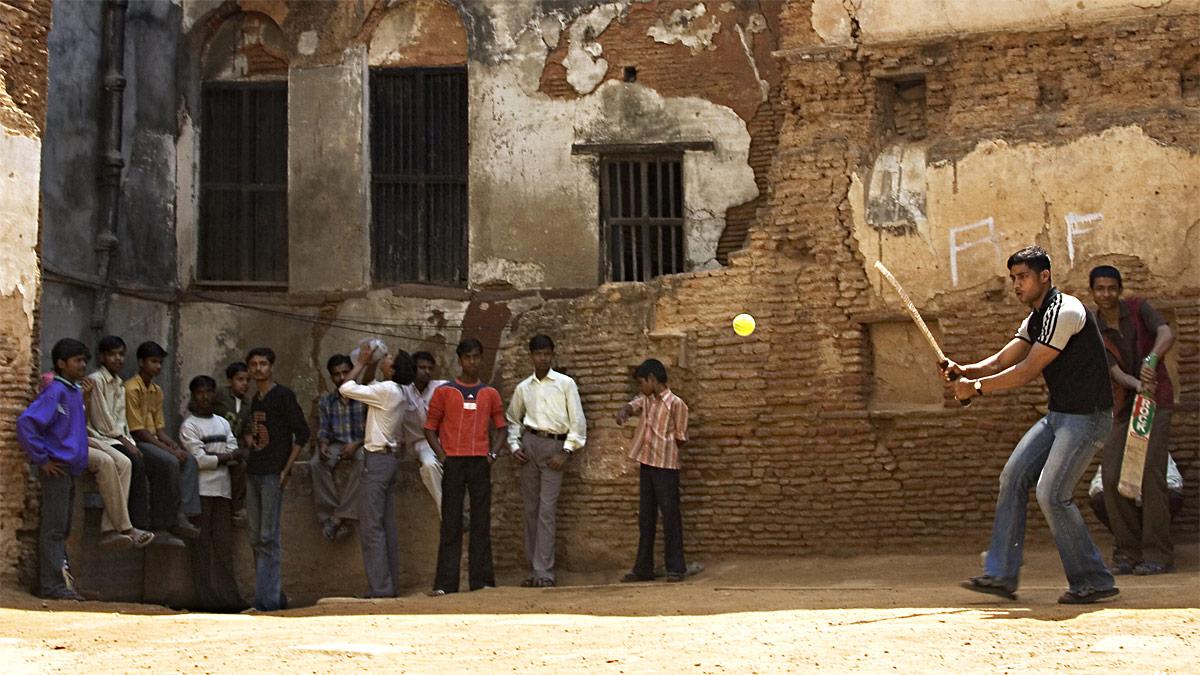 Young players take to the street in Varanasi. The brick wall becomes a wicket and the neighbourhood lane transforms into a cricket pitch.