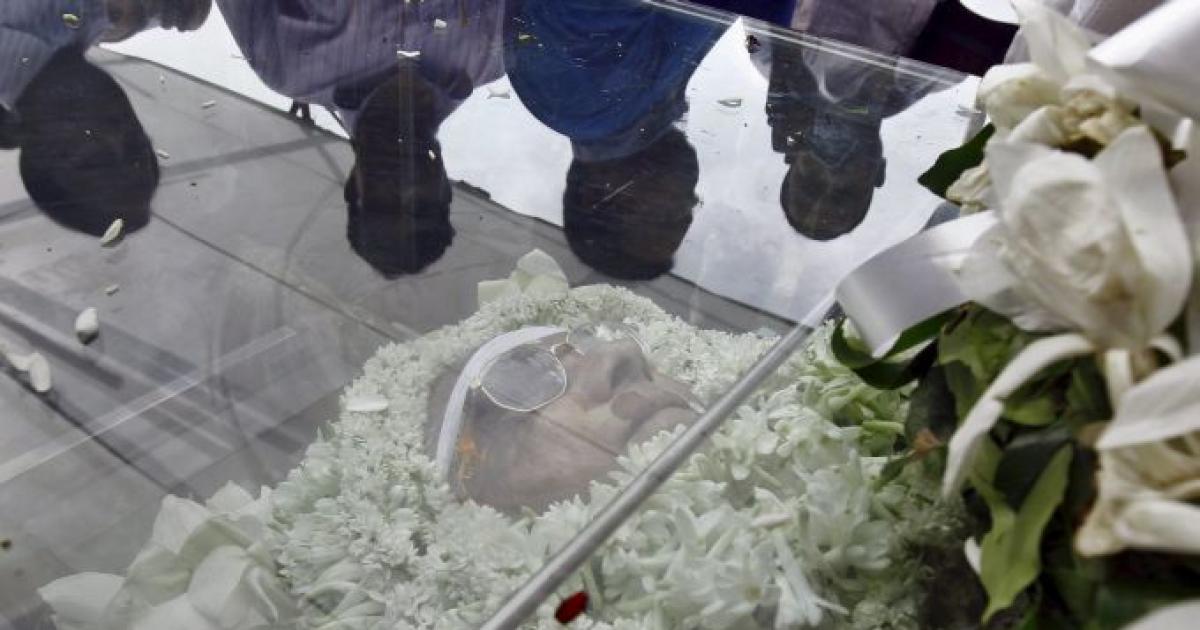 People are reflected in the casket containing the body of Jagmohan Dalmiya, president of Board of Control for Cricket in India (BCCI), as they pay homage at the Eden Gardens