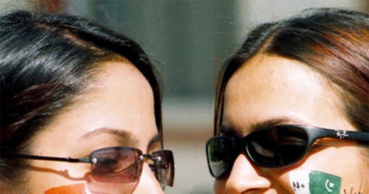 Image: Indian cricket fans with their faces painted with national flags of India (left) and Pakistan