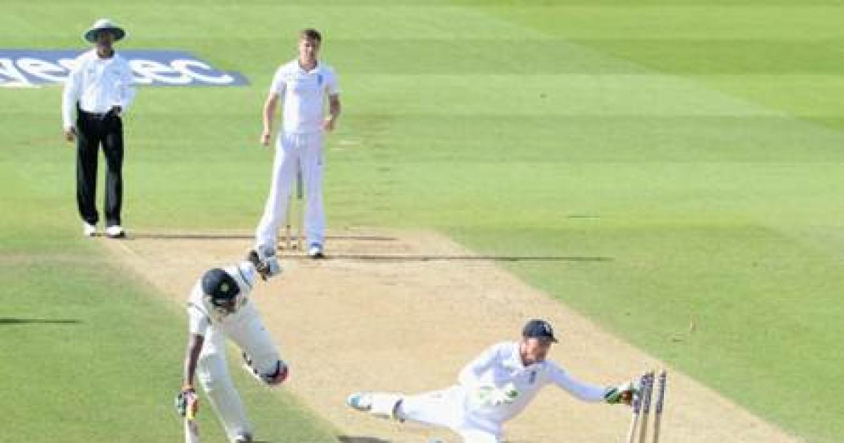 Image: England's Jos Buttler runs out Varun Aaron of India during Day 3 of the fifth Investec Test at The Kia Oval, London.