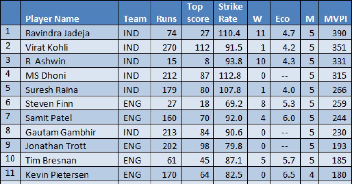 Table 1: Most valuable players in the India-England series (Oct 14-25, 2011)