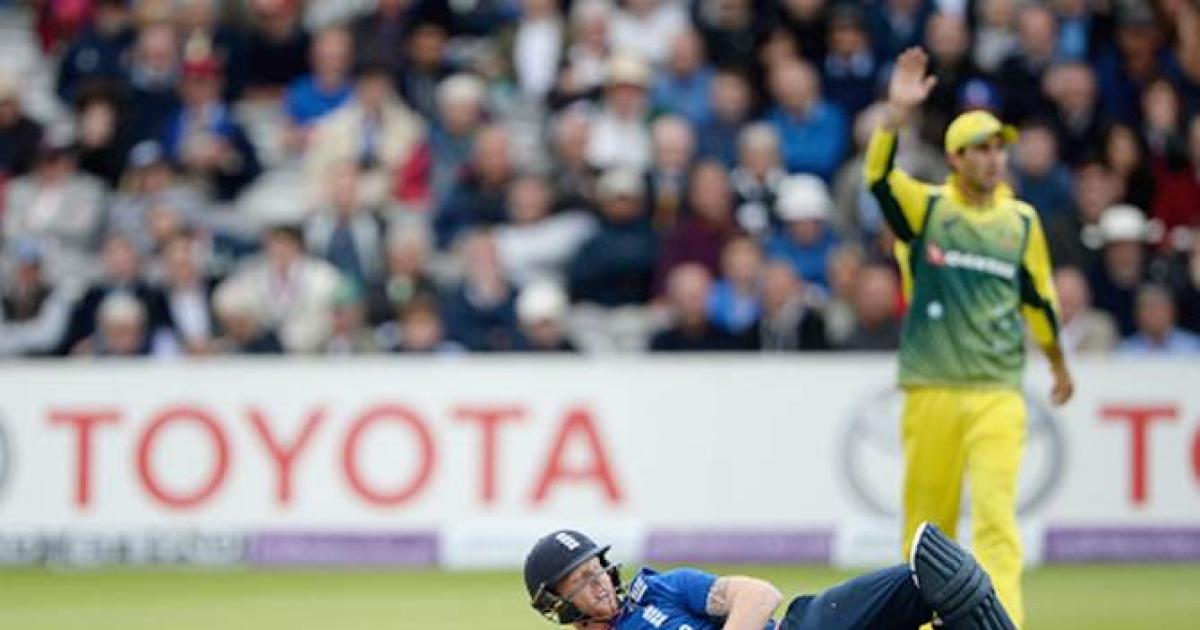 IMAGE: England’s Ben Stokes lies on the ground after avoiding the ball thrown by Australia’s Mitchell Starc during the second One-Day International, at Lord's, on September 5, 2015. The batsman was given out for disrupting the field. Photograph: Gareth Copley/Getty Images