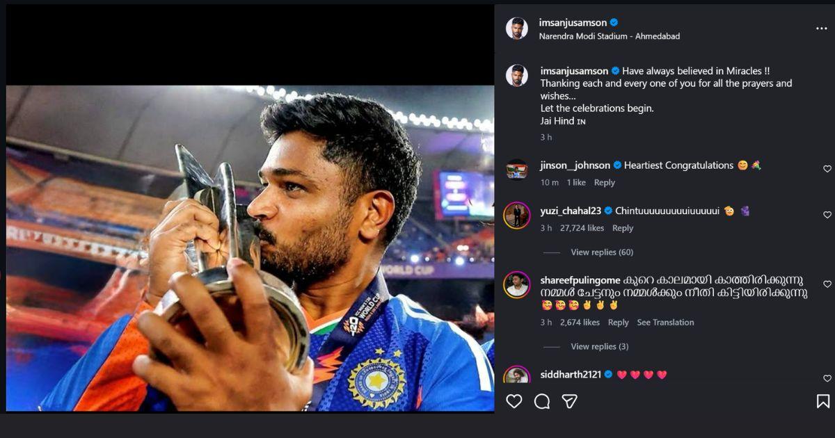 Sanju Samson, who almost single-handedly guided the team to the T20 World Cup final and starred again in the title clash against New Zealand with 89 off 42 balls on Sunday, thanked his fans for their prayers.