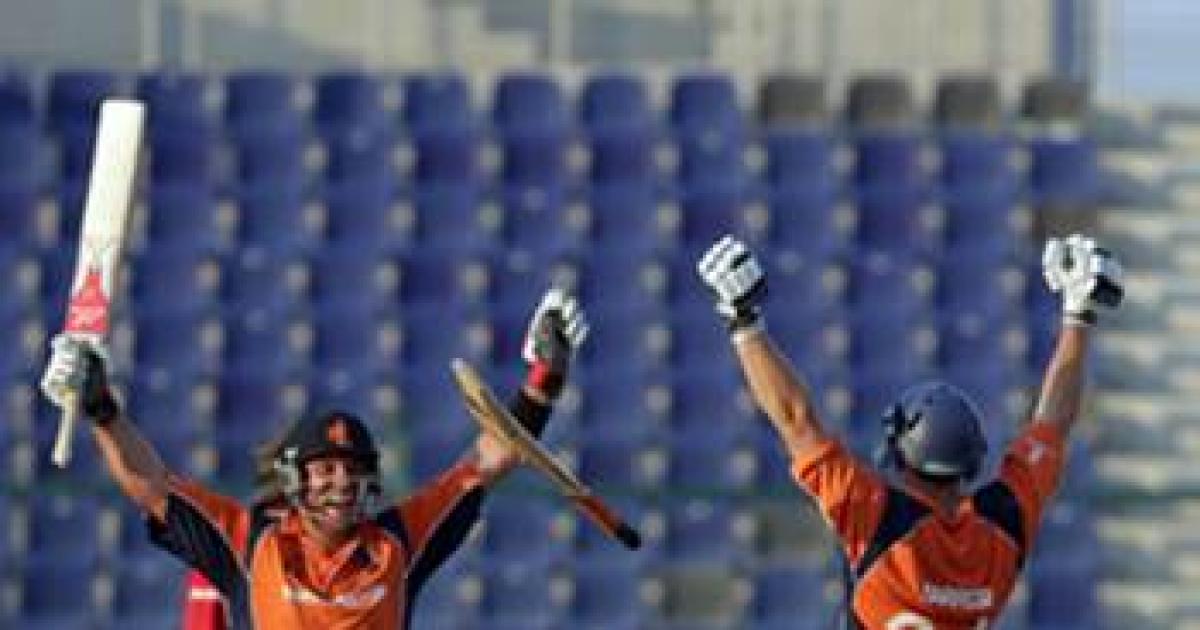 Image: Michael Swart (left) and Wesley Barresi of the Netherlands celebrate after defeating Scotland in the quarter-final match 66 at the ICC World Twenty20 Qualifiers at the Zayed Cricket Stadium in Abu Dhabi on Thursday.