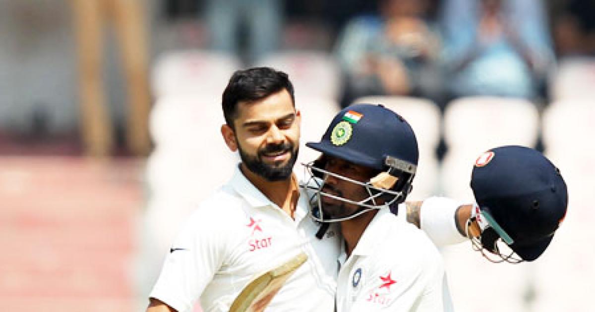 Image: Wriddhiman Saha congratulates Virat Kohli after the Indian captain completed his double century on Friday
