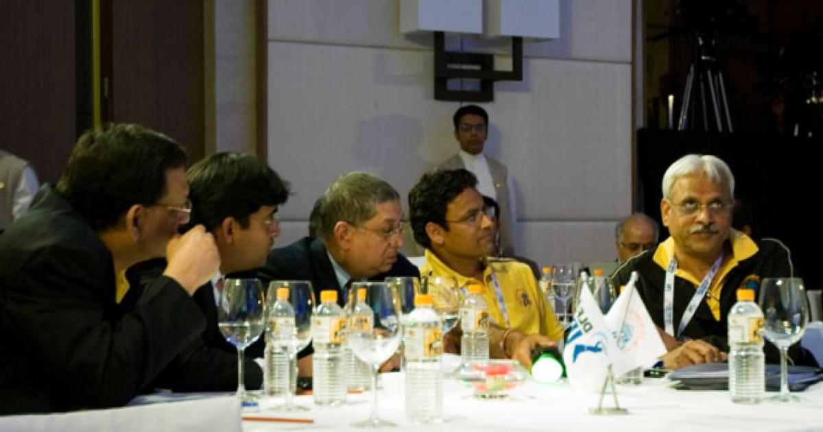 Narayanswami Srinivasan (centre) with officials of Chennai Super Kings during the Indian Premier League players' auction in January 2010. Photograph: Ritam Banerjee/Getty Images