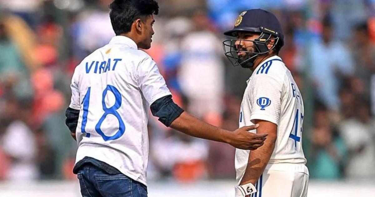 A fan breach security and touch Rohit Sharma's feet on Day 1 of the first Test between India and England in Hyderabad on Thursday, January 25, 2024.