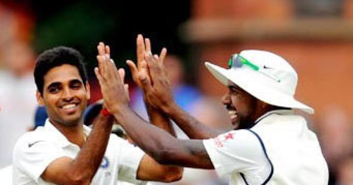 Image: Bhuvneshwar Kumar (left) is congratulated by teammate Varun Aaron after claiming a wicket in the recent Test series in England.