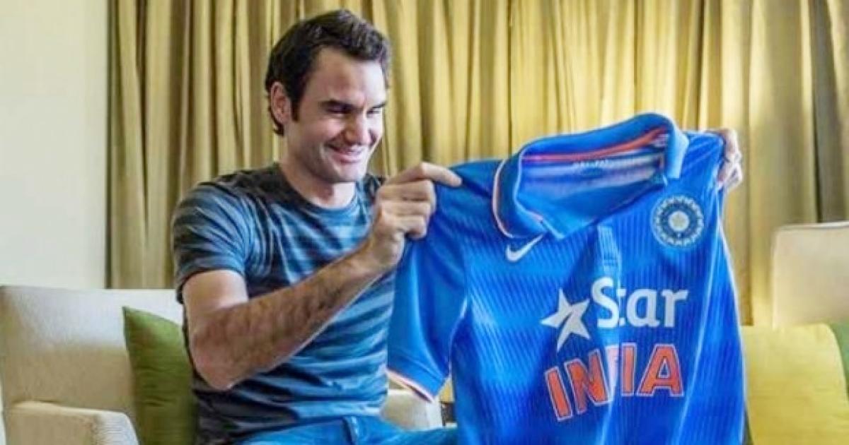 Roger Federer with the Team India jersey. Photograph: BCCI/Twitter