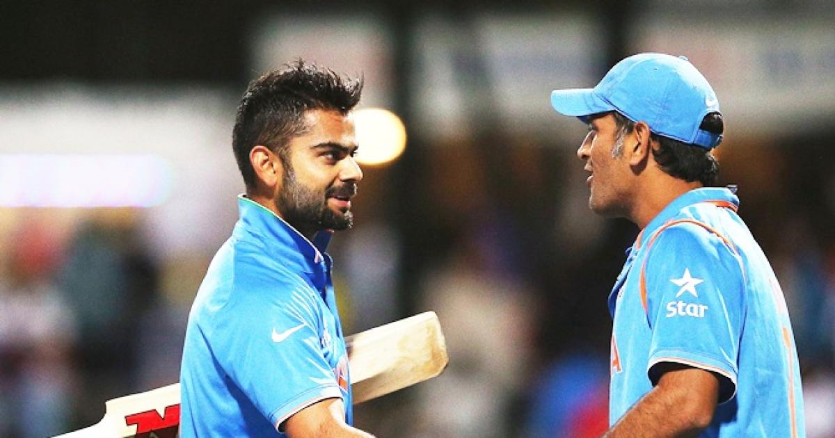 Virat Kohli of India is congratulated by Mahendra Singh Dhoni