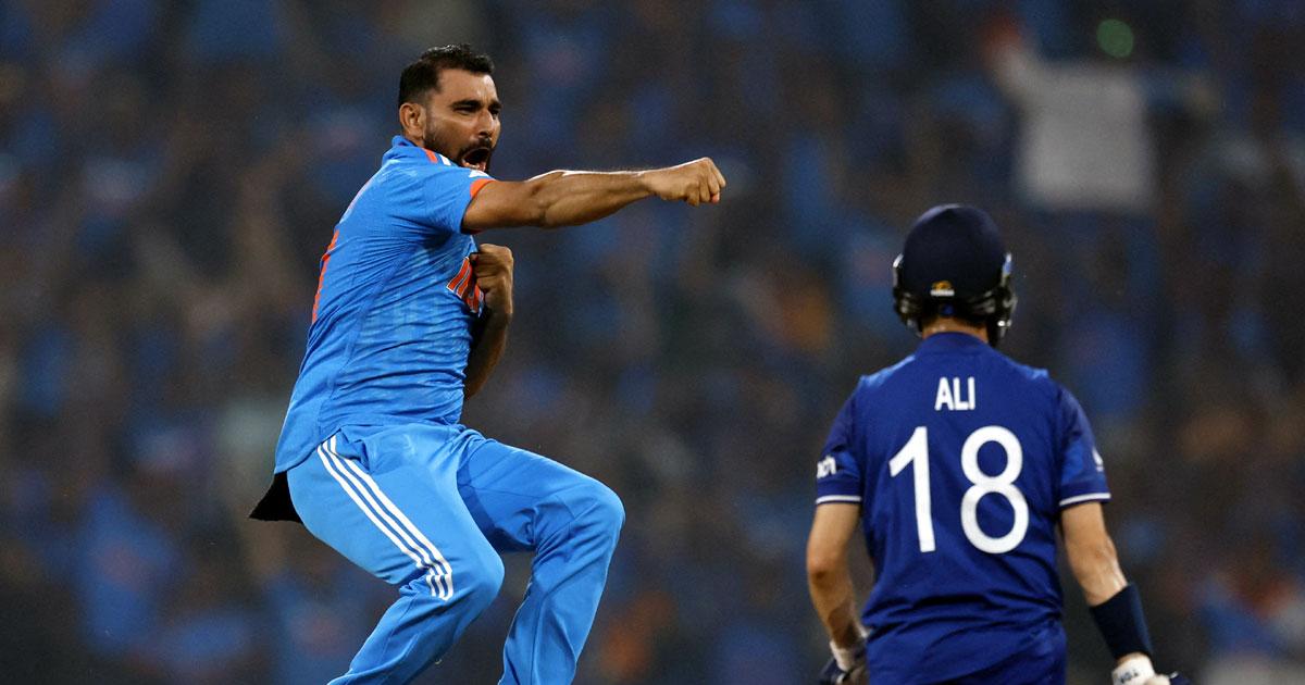 IMAGE: Mohammed Shami celebrates. Photograph: Andrew Boyers/Reuters