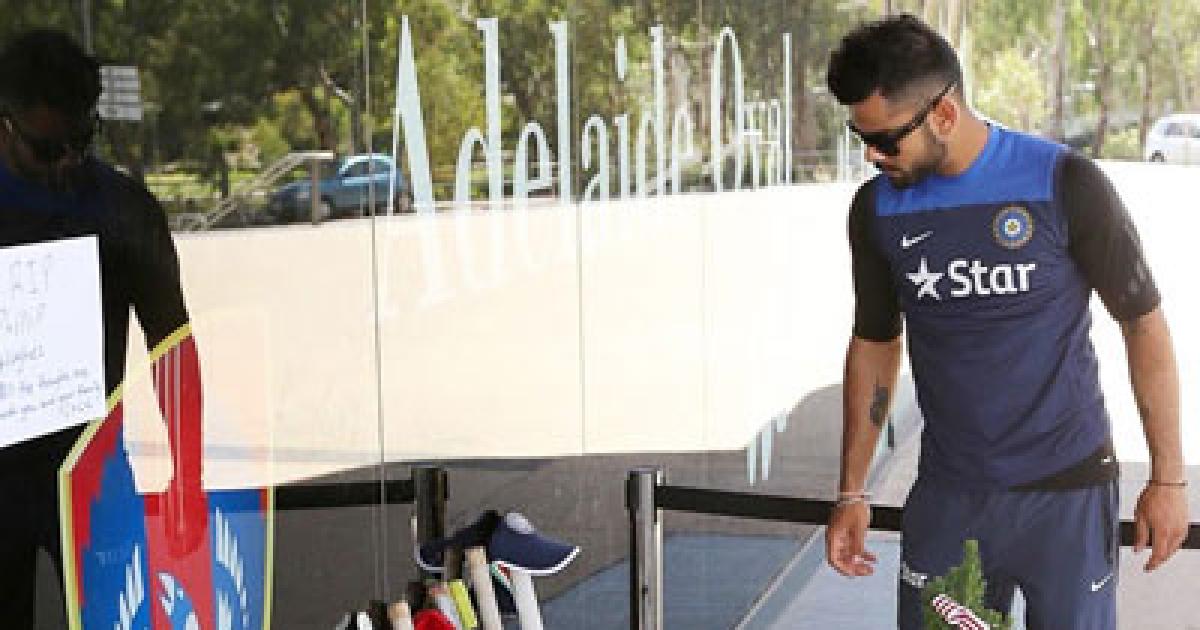 Image: Virat Kohli of India leaves a bat and cap at a memorial for Phil Hughes outside the Adelaide Oval.