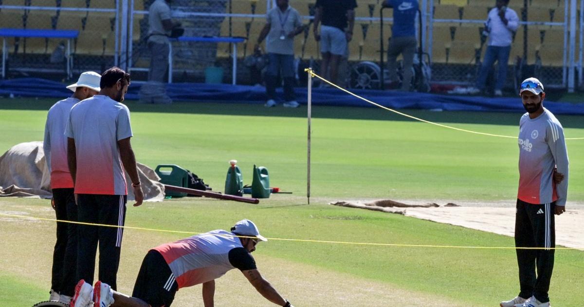 IMAGE: India players and support staff assess pitch during a practice session before the second Test match against South Africa, in Guwahati. Photograph: ANI Photo