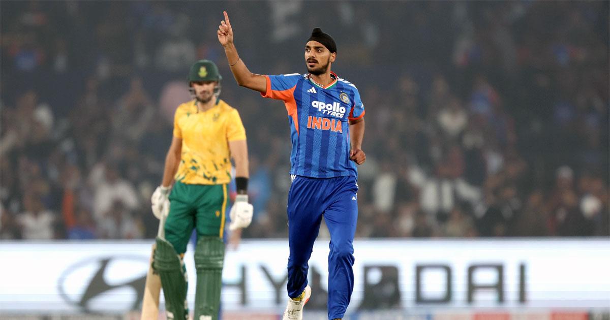 IMAGE: Arshdeep Singh celebrates with team-mates after taking the wicket of Quinton de Kock. Photograph: BCCI/X