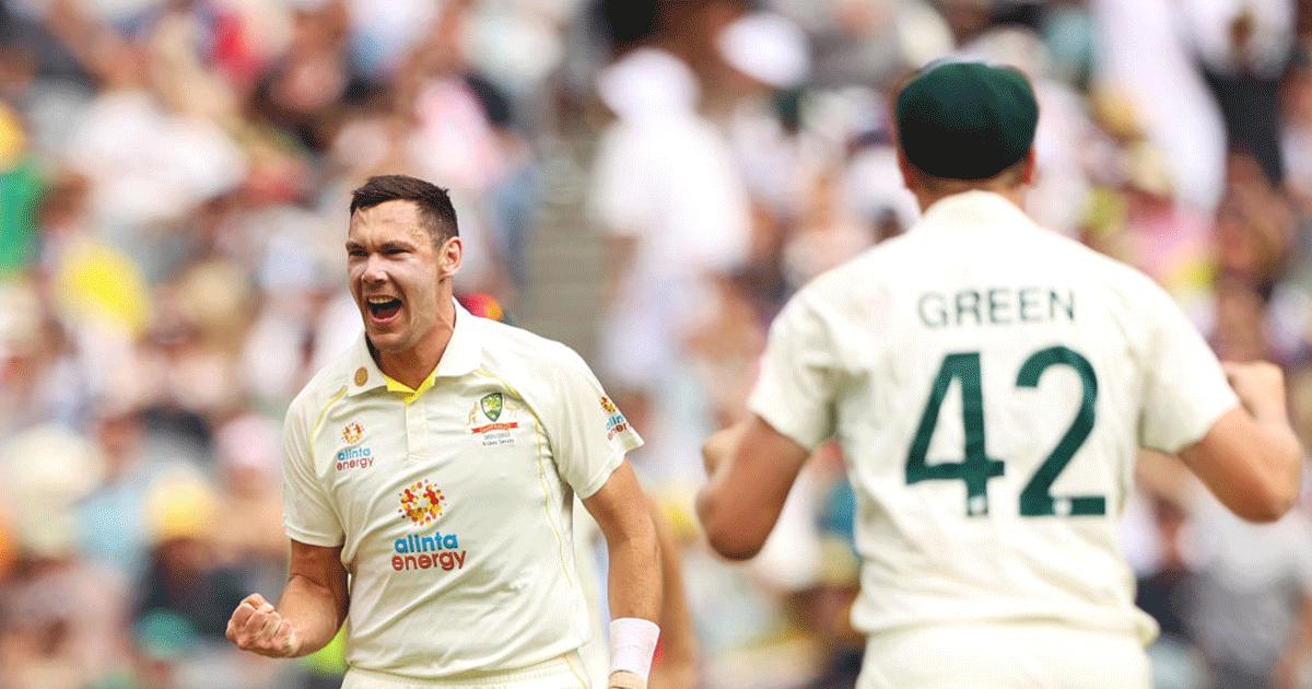 IMAGE: Australia's Scott Boland takes his first Test wicket by dismissing England's Mark Wood on Day 1 of the 3rd Ashes Test at Melbourne Cricket Ground on Sunday. Photograph: Robert Cianflone/Getty Images