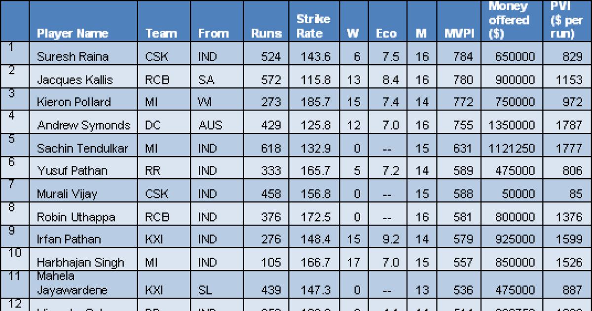 IPL3's 50 best players We list the fifty players with the highest values of the most valuable player index (MVPI). MVPI is the sum of a player's batting, bowling and fielding points. The batting points are based on total runs scored and the strike rate. The bowling points are based on wickets taken (20 points per wicket) and the economy rate. The fielding points are based on catches taken (5 points per catch), stumpings carried out and participation in run out dismissals.