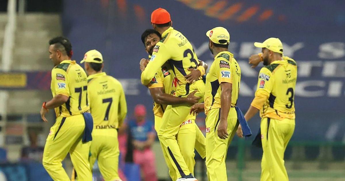 IMAGE: Chennai Super Kings celebrate the fall of a Rajasthan Royals wickets at the Sheikh Zayed stadium in Abu Dhabi, October 2, 2021. Photograph: BCCI
