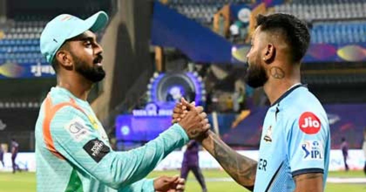 IMAGE: LSG Skipper K L Rahul and GT Captain Hardik Pandya, great buddies off the field, greet each other after the game.