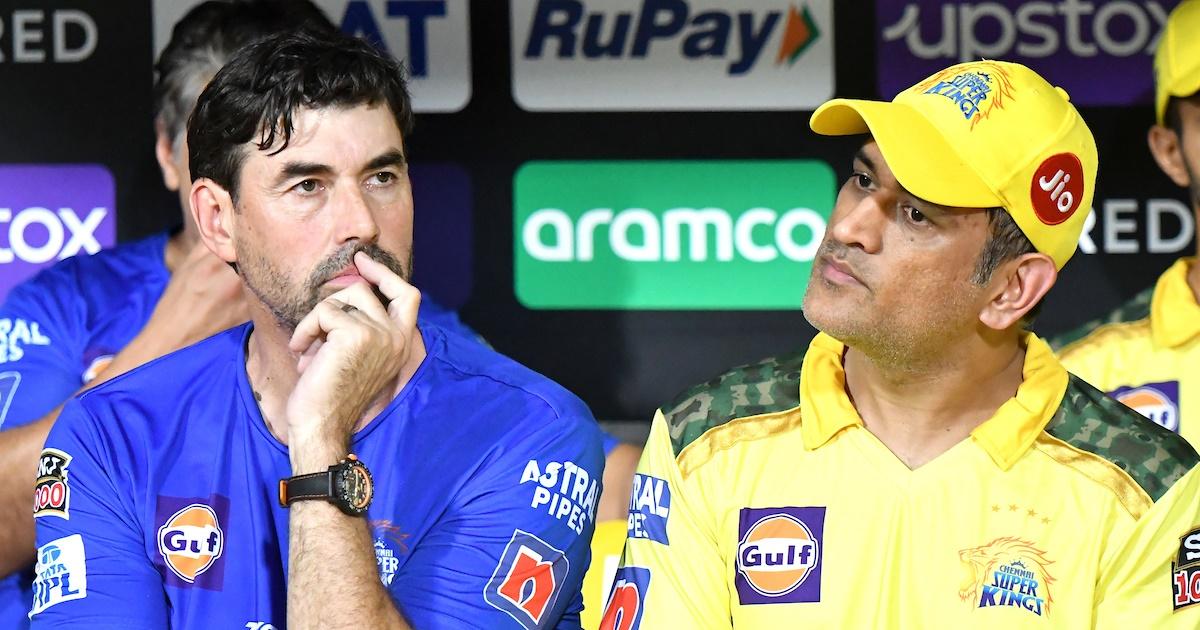 IMAGE: Chennai Super Kings Coach Stephen Fleming and Captain MS Dhoni were left helpless after Conway's unfair dismissal for an LBW. Photograph: BCCI