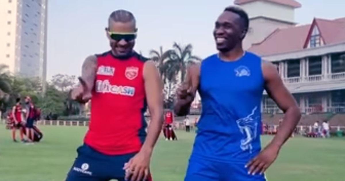 Punjab Kings opener Shikhar Dhawan shook a leg with Chennai Super Kings all-rounder Dwayne Bravo as they caught up during their team's practice session.