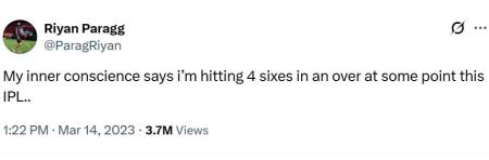 'My inner conscience says i'm hitting 4 sixes in an over at some point this IPL..' Parag had tweeted two years ago, ahead of IPL 2023.