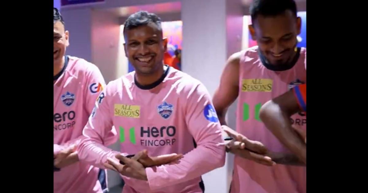The Delhi Capitals squad, including Captain Axar Patel, Mitchell Starc and Mentor Kevin Pietersen, performed a baby-swaying gesture in the dressing room.