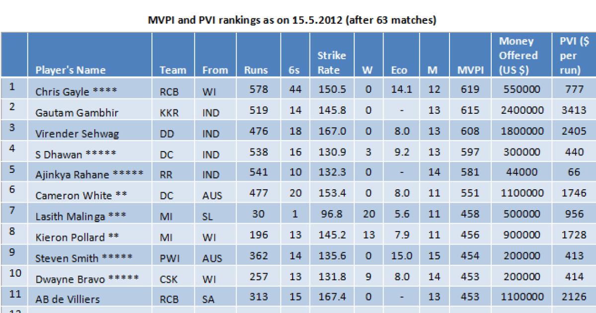 Generally speaking, an auctioned player offers 'outstanding' value if his paisa vasool index (PVI) is below 500 (*****); 'excellent' value if the PVI lies between 500-1000 (****), 'very good' value for a PVI between 1000-1500 (***) and 'good' value for a PVI between 1500-2000 (**).