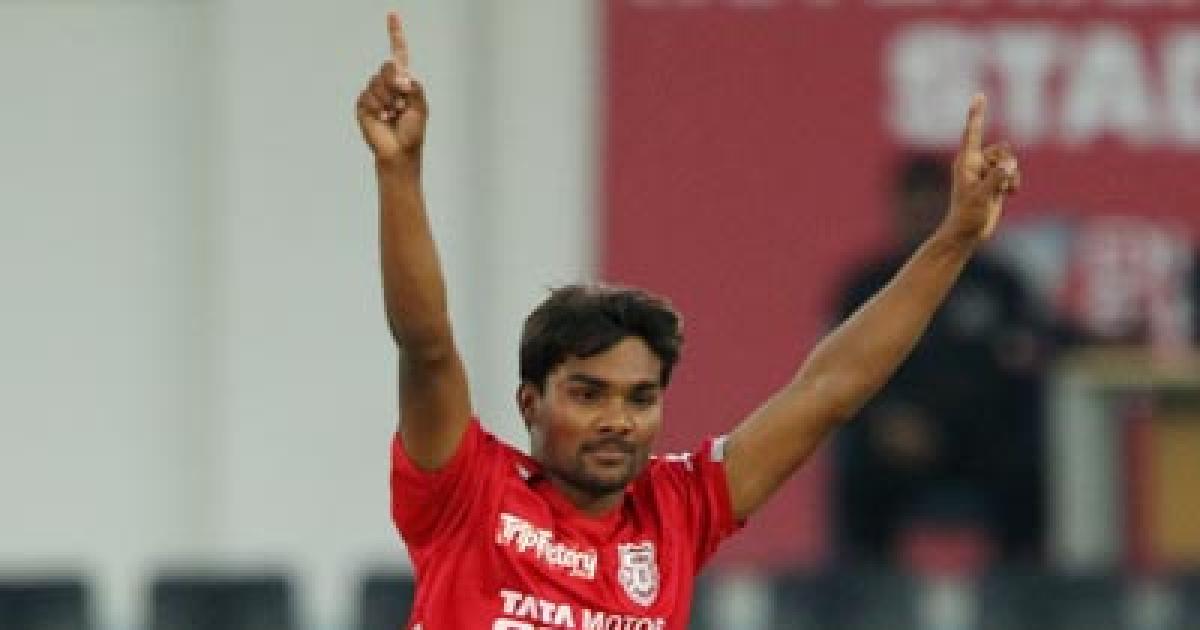 Image: Kings XI Punjab's Sandeep Sharma celebrates taking a Royal Challengers Bangalore wicket
