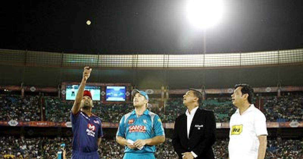 Image: Delhi Daredevils captain Mahela Jayawardene tosses the coin as Pune Warriors captain Aaron Finch looks on.