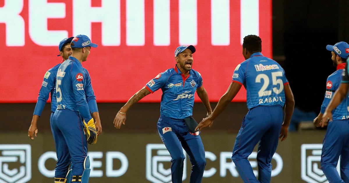 IMAGE: Delhi Capitals players celebrate after Shikhar Dhawan catches Chennai Super Kings batsman Faf du Plessis off the bowling of Kagiso Rabada during their IPL match in Sharjah. Photograph: BCCI/IPL