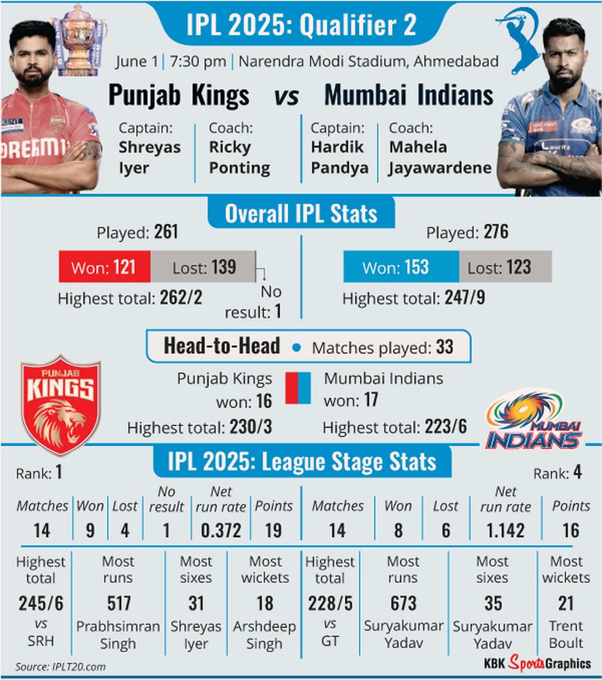 A rampant Mumbai Indians will present a stern test of character for the rattled Punjab Kings in a virtual semi-final when the two teams face-off in Qualifier 2 of the Indian Premier League in Ahmedabad on Sunday.