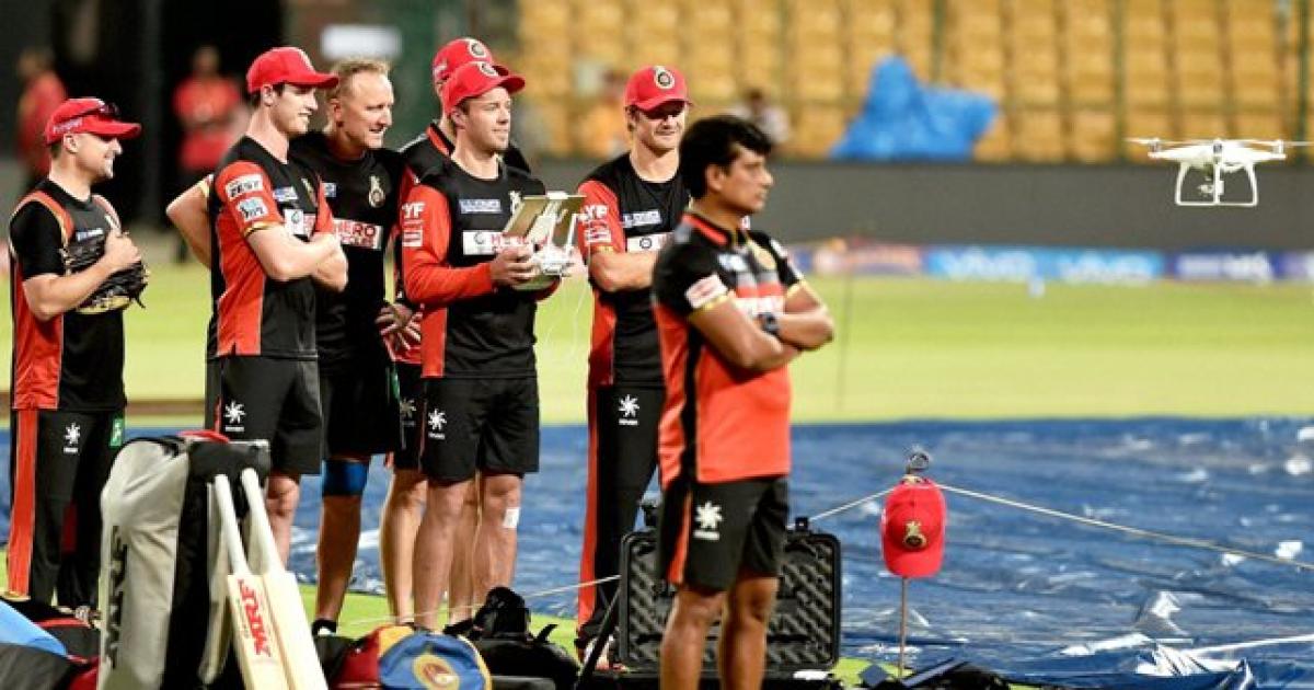 IMAGE: Royal Challengers Bangalore AB de Villiers operates a drone camera with Shane Watson during a training session in Bengaluru on Saturday. Photograph: PTI