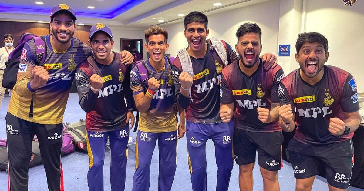 IMAGE: Jubilant Kolkata Knight Riders Venkatesh Iyer, Kamlesh Nagarkoti, Shivam Mavi, Shubman Gill, Nitish Rana, Rahul Tripathi celebrate winning the Qualifier 2 match against Delhi Capitals. Photograph and Video: Kind courtesy KKR/Instagram