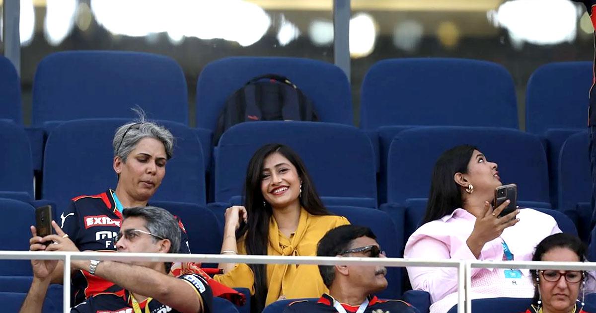 IMAGE: Dhanashree Verma-- RCB leggie Yuzvendra Chahal's missus, dancer, dentist, YouTube star -- appears pleased with the way the game is going. All Photographs: Arjun Singh/Sportzpics for BCCI/IPL