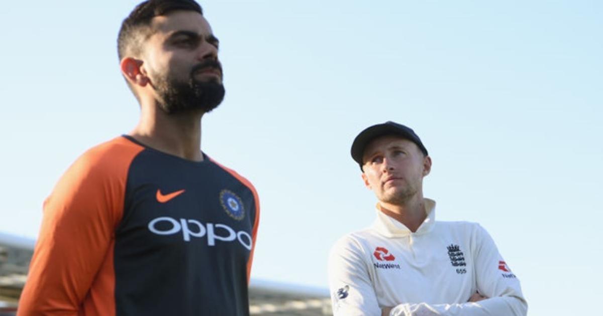 IMAGE: England captain Joe Root, right, and India captain Virat Kohli after the 5th Test. Photograph: Stu Forster/Getty Images