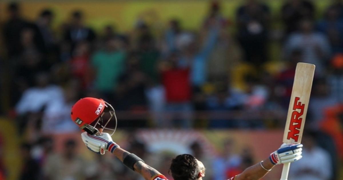 IMAGE: RCB captain Virat Kohli celebrates his century against Gujarat Lions. Photograph: BCCI.