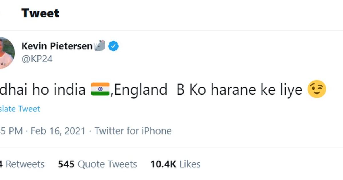 Former England captain Kevin Pietersen on Tuesday put out a cheeky congratulatory tweet for Team India after Virat Kohli’s team hammered England by 317 runs on a dustbowl to win the 2nd Test in Chennai on Test.